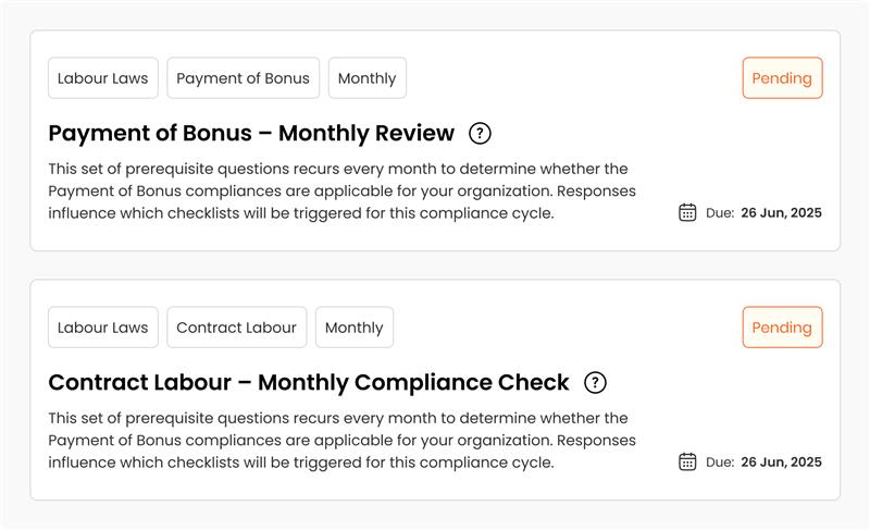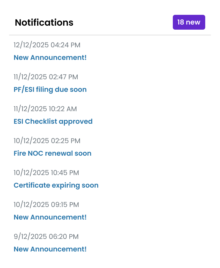 Like “PF/ESI filing due in 3 days”, “Fire NOC renewal by 15 Aug.”